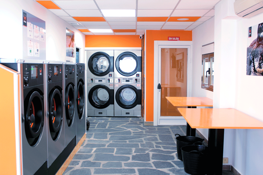 Galería 01 Secadoras de 16 kilos de carga y cámara de vigilancia. 02 Vista desde el escaparate. 03 Vista desde las secadoras. 04 Display de la lavadora de 8 kilos. 05 Máquina de cambio y central de pago. 06 Lavadoras listas para trabajar. 07 "Viva Tere" en negro, blanco y naranja.